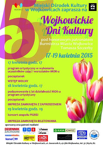 Tegoroczne Wojkowickie Dni Kultury odbędą się 17-19 kwietnia. Pierwszego dnia zaprezentują swoje umiejętności uczestnicy zajęć oraz warsztatów, odbywających się cyklicznie na terenie ośrodka, dokonane zostanie również podsumowanie dotychczasowej działalności placówki. Podczas drugiego dnia Jubileuszu chcielibyśmy podziękować tym, którzy przyczyniają się do rozwoju naszej placówki. Trzeciego dnia natomiast na scenie MOK-u wystąpi Zespół PIERSI.