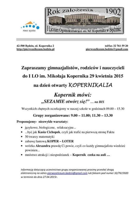 Serdecznie zapraszamy wszystkich uczniów klas III Gimnazjum w dniu 29 kwietnia br. od godz. 9.00 do naszej szkoły - odbędą się "Kopernikalia na bis".