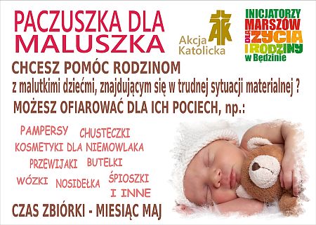 W maju odbywać się będzie w Będzinie zbiórka pod hasłem „PACZUSZKA dla MALUSZKA”. Jej celem jest zebranie jak największej: ilości pampersów, śpioszków, ubranek, kosmetyków dla niemowlaków i malutkich dzieci, wózków, chodzików, butelek do karmienia, smoczków, kocyków, i wszystkiego co potrzebne jest rodzicom mającym niemowlaki i malutkie dzieci. Zebrane w trakcie zbiórki rzeczy i sprzęt, trafią do rodziców, a także samotnych matek z Będzina, znajdujących się w trudnej sytuacji materialnej. Zbiórka jest przygotowaniem do V Marszu dla Życia i Rodziny, który przejdzie ulicami Będzina 7 czerwca (początek g.15.00 kościół św. Trójcy). Inicjatorami zbiórki są członkowie Akcji Katolickiej z Będzina.