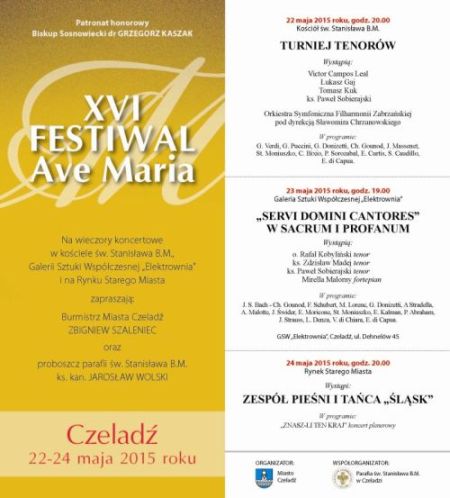 Na trzy wieczory koncertowe Festiwalu Ave Maria, które odbędą się w dniach 22-24 maja w kościele św. Stanisława, Galerii Elektrownia i na rynku Starego Miasta zapraszają Miasto Czeladź i parafia św. Stanisława.