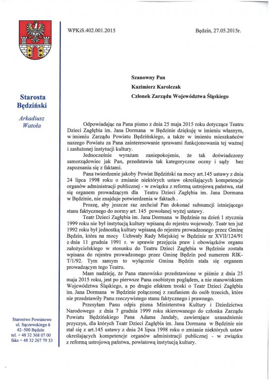 Prezentujemy kopie dwóch ważnych dokumentów dotyczących Teatru Dzieci Zagłębia im. Jana Dormana w Będzinie: