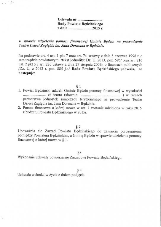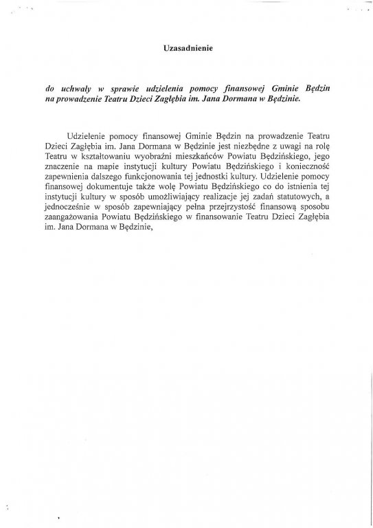 Udzielenie pomocy finansowej gminie Będzin na prowadzenie Teatru Dzieci Zagłębia im. Jana Dormana w Będzinie jest niezbędne z uwagi na rolę Teatru w kształtowaniu wyobraźni mieszkańców Powiatu Będzińskiego, jego znaczenie na mapie instytucji kultury Powiatu Będzińskiego i konieczność zapewnienia dalszego funkcjonowania tej jednostki kultury.