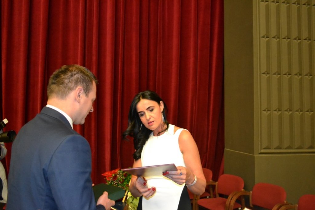 List gratulacyjny oraz słowa uznania za działalność naukową, kulturalną i społeczną dla Wyższej Szkoły Biznesu na ręce Jej Magnificencji Rektor prof. nadzw. dr Zdzisławy Dacko – Pikiewicz złożył w imieniu Starosty Będzińskiego Arkadiusza Watoły Sekretarz Powiatu Będzińskiego Tomasz Dzierżanowski.