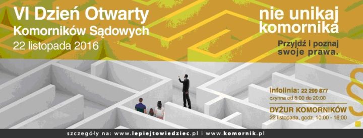 Krajowa Rada Komornicza we współpracy z izbami komorniczymi w dniu 22.11.2016r. organizuje VI Ogólnopolski Dzień Otwarty Komorników Sądowych pod hasłem „Nie unikaj komornika”.