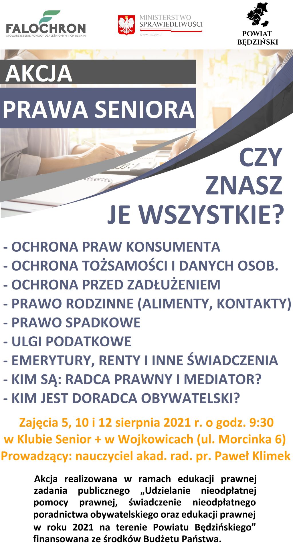 Akcja pt. "Prawa Seniora" realizowana jest w ramach edukacji prawnej zadania publicznego „Udzielanie nieodpłatnej pomocy prawnej, świadczenie nieodpłatnego poradnictwa obywatelskiego oraz edukacji prawnej w roku 2021 na terenie Powiatu Będzińskiego”.