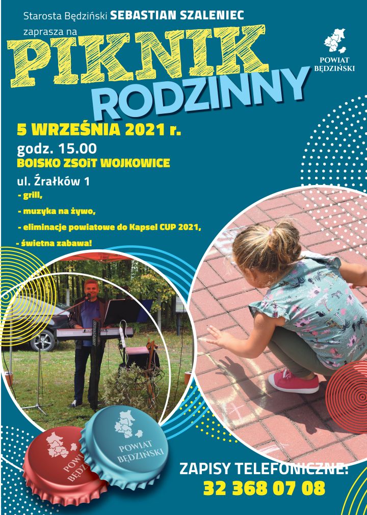 Starosta Będziński Sebastian Szaleniec zaprasza na PIKNIK RODZINNY, który odbędzie się 5 września o godz. 15.00 na terenie Zespołu Szkół Technicznych i Ogólnokształcących w Wojkowicach. Muzyka na żywo, grill, eliminacje do KAPSEL CUP 2021, możliwość wykonania bezpłatnych badań - te i inne atrakcje czekać będą na uczestników wydarzenia.