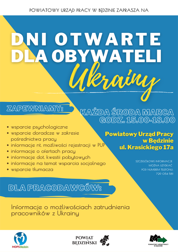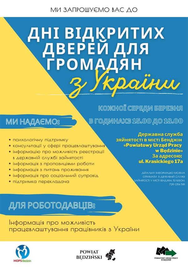 Powiatowy Urząd Pracy w Będzinie zaprasza na dni otwarte dla obywateli Ukrainy