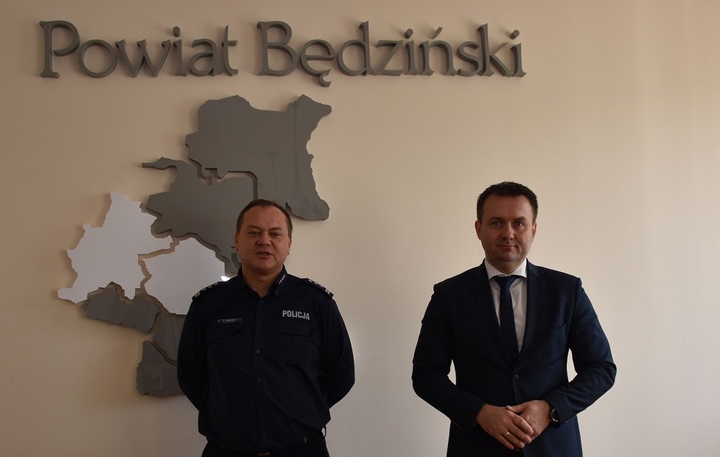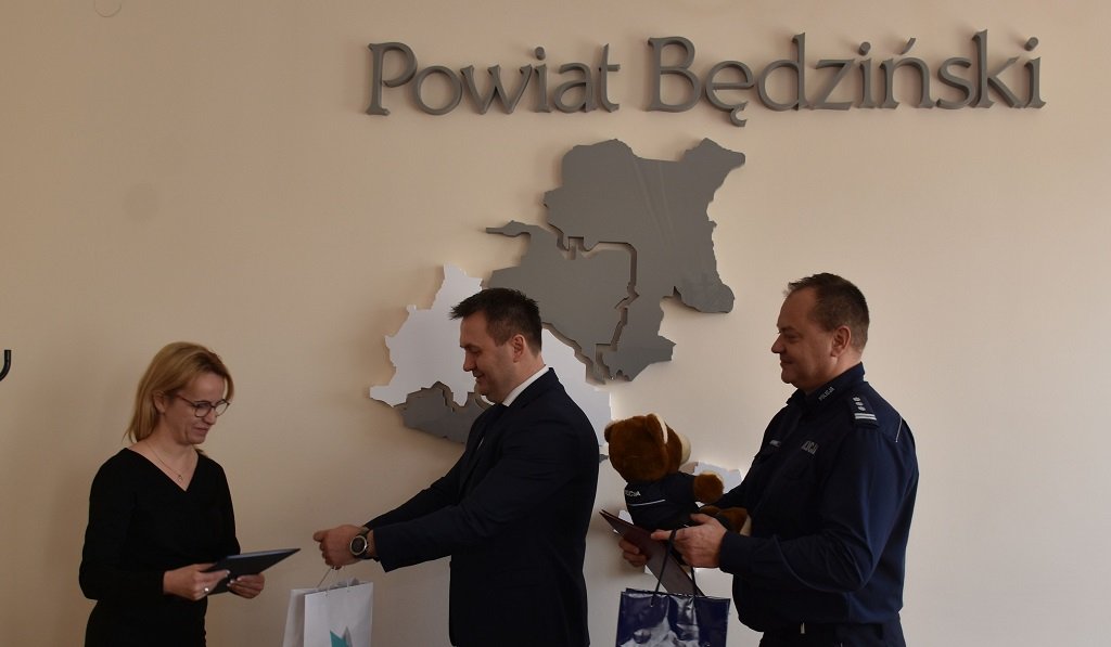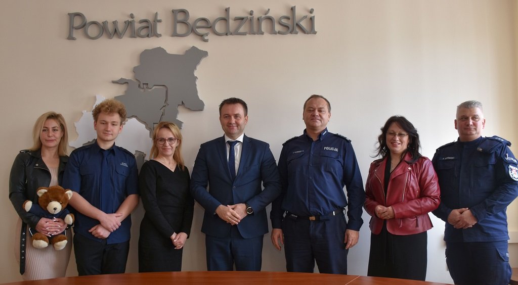 Dzisiaj o godzinie 9.00 w budynku Starostwa Powiatowego w Będzinie odbyło się uroczyste nagrodzenie uczniów klasy policyjnej Zespołu Szkół Ogólnokształcących i Technicznych w Wojkowicach. Starosta Będziński Sebastian Szaleniec wraz z Komendantem Komendy Powiatowej Policji w Będzinie insp. Arkadiuszem Więckiem wręczyli wyróżnienia dla uczniów w imieniu Komendanta Głównego Policji gen. insp. dr Jarosława Szymczyka oraz Prezesa Instytutu Pamięci Narodowej Jarosława Szarka.