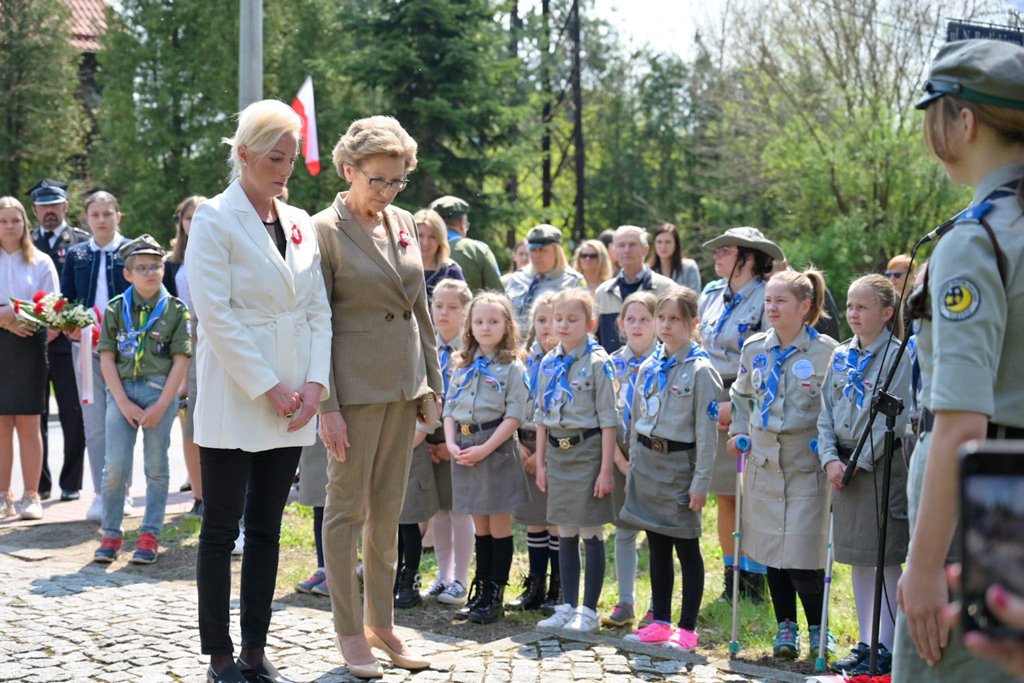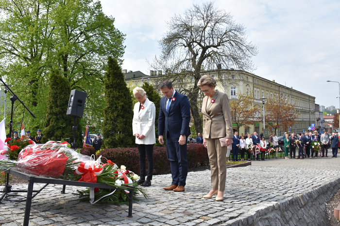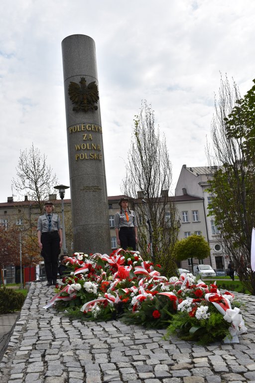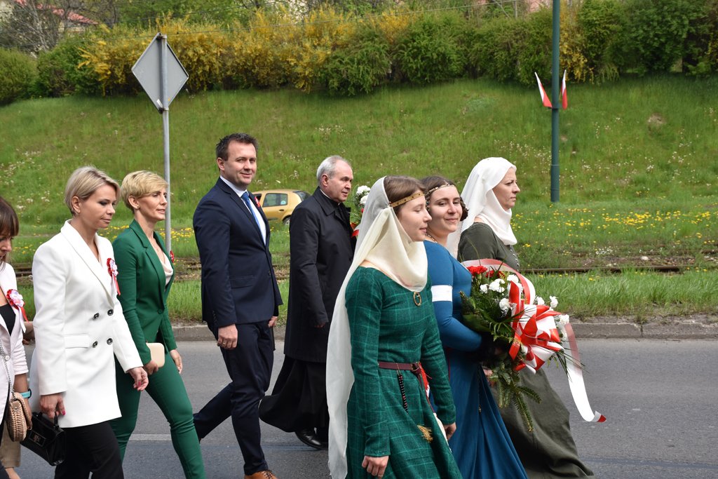 Po mszy nastąpił uroczysty przemarsz na Plac 3 Maja, gdzie pod pomnikiem „Poległym za Wolną Polskę” oraz pod tablicą poświęconą żołnierzom walczącym o wolność na Placu Kardynała Jean-Marie Lustigera w Będzinie, okolicznościowe wieńce złożył Starosta Będziński Sebastian Szaleniec wraz z Członkiem Zarządu Powiatu Będzińskiego Haliną Mentel i Sekretarz Powiatu Agatą Fazan.