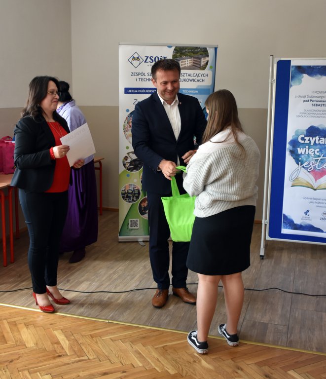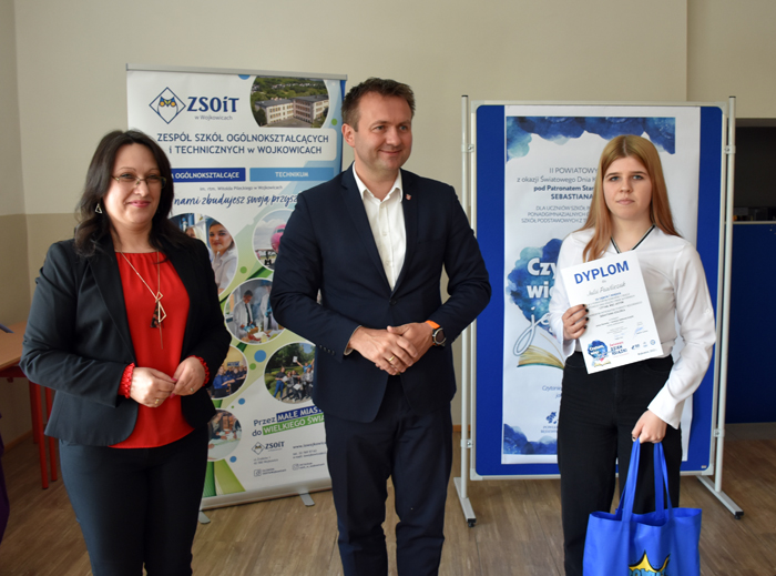 Dzisiaj Starosta Będziński – Sebastian Szaleniec na zaproszenie Dyrektor Zespołu Szkół Ogólnokształcących i Technicznych w Wojkowicach – Justyny Pitas uczestniczył w uroczystym podsumowaniu II Powiatowego Konkursu z okazji Światowego Dnia Książki i Praw Autorskich – „Czytam, więc jestem”, na pracę literacką lub plastyczną. Komisja konkursowa była pełna uznania dla twórczości utalentowanej młodzieży i w wyniku obrad wyłoniła tegorocznych zwycięzców w dwóch kategoriach wiekowych – szkół podstawowych i ponadpodstawowych. Laureatom zostały wręczone nagrody.