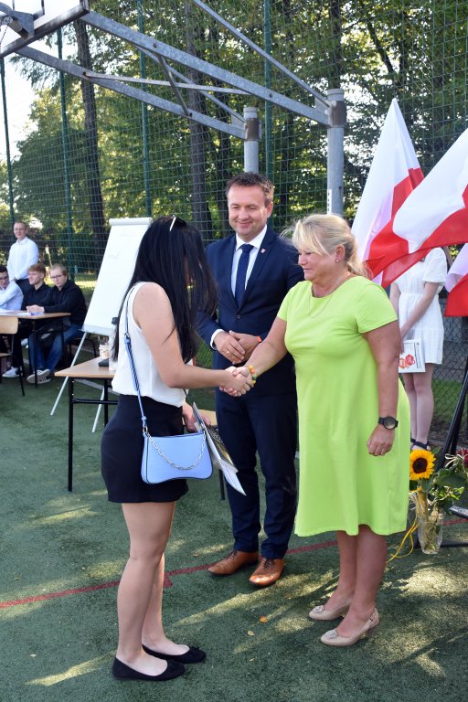 Tego dnia w imieniu Starosty Będzińskiego wszystkim uczniom z Zespołu Szkół Ogólnokształcących i Technicznych im. Jana Pawła II w Siewierzu bezpiecznych i udanych wakacji życzyli: Wicestarosta Będziński Dariusz Waluszczyk wraz z Wiceprzewodniczącym Rady Powiatu Będzińskiego Janem Muchą i Radną Rady Powiatu Będzińskiego Moniką Pawłowską-Dyszy. Wyrazy uznania dla nauczycieli za trud włożony w nauczanie i wychowywanie młodego pokolenia przekazał nauczycielom i uczniom z III LO im. C.K. Norwida oraz Centrum Kształcenia Zawodowego i Ustawicznego w Będzinie reprezentujący Starostę - Etatowy Członek Zarządu Powiatu Będzińskiego - Adam Szydłowski.
