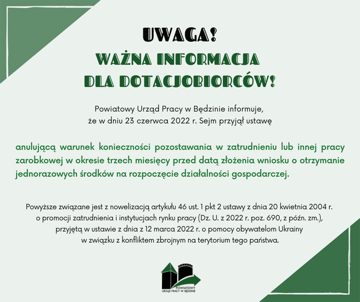 Powiatowy Urząd Pracy w Będzinie informuje, że w dniu 23 czerwca 2022 r. Sejm przyjął ustawę anulującą warunek konieczności pozostawania w zatrudnieniu lub innej pracy zarobkowej w okresie trzech miesięcy przed datą złożenia wniosku o otrzymanie jednorazowych środków na rozpoczęcie działalności gospodarczej.