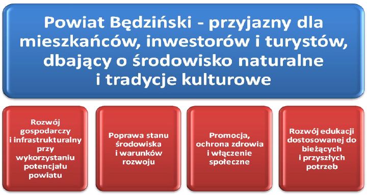Wizja Powiatu Będzińskiego koncentruje się na stworzeniu środowiska przyjaznego mieszkańcom, przedsiębiorcom i turystom oraz podniesieniu poziomu ich życia przez zapewnienie trwałego, zrównoważonego rozwoju.
