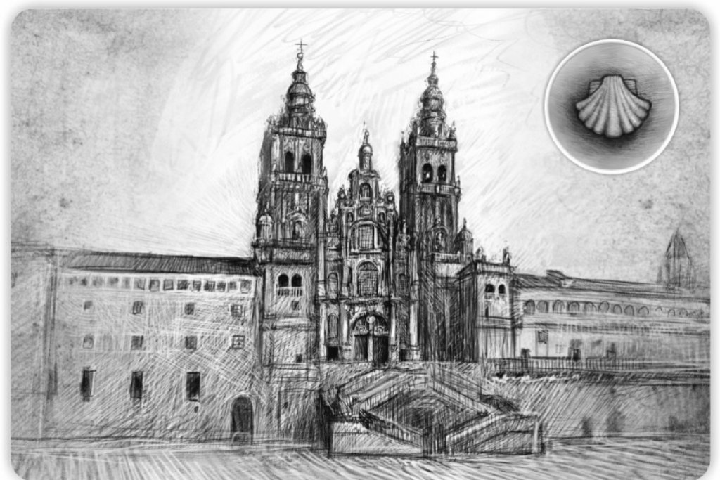 Na pocztówkach uwieczniono Wzgórze św. Doroty w Będzinie, kościół św. Jakuba w Sączowie, a także trzy sławkowskie obiekty, oznaczone muszlą św. Jakuba – kościół parafialny pw. Podwyższenia Krzyża Świętego, kościółek zlokalizowany przy Rynku i Szkolne Schronisko Młodzieżowe. Całość otwiera rycina przedstawiająca katedrę w Santiago de Compostela. To do niej właśnie zmierzają wędrujący szlakiem pielgrzymi. Na obwolucie znajduje się także krótka informacja o historii i znaczeniu szlaku, który jest jedną z najstarszych i najważniejszych dróg pielgrzymkowych Europy. Wydawnictwo zostało dofinansowane przez powiat będziński. Wszystkie szkice wykonane zostały natomiast przez Olgę Pasamonik.