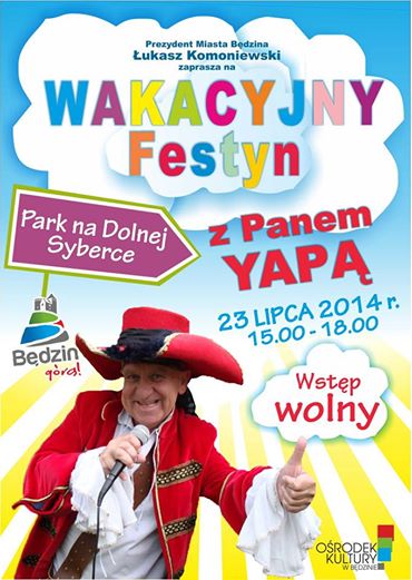 W środę 23 lipca w parku na Dolnej Syberce odbędzie się festyn dla najmłodszych. Od godz. 15.00 do 18.00 Pan Yapa poprowadzi zabawy i zadba o wspaniały humor wszystkich uczestników festynu. Wstęp wolny.