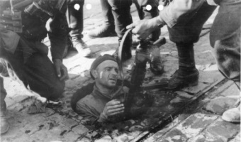 Na zdjęciu: Powstaniec z Mokotowa wychodzi z kanałów na terenie zajętym przez Niemców. Zdjęcie prawdopodobnie gdzieś w alei Puławskiej pomiędzy ulicą Madalińskiego a Dworkową. Źródło: pl.wikipedia.org