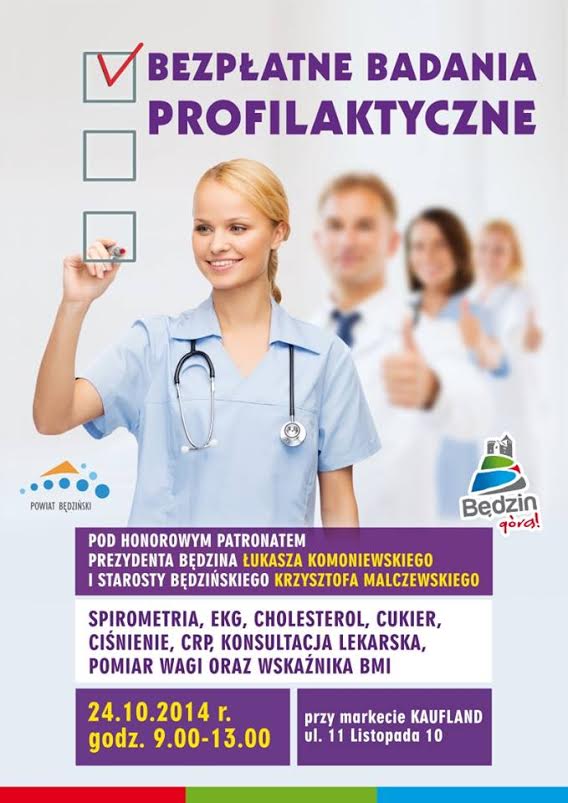 W piątek 24 października 2014 r. w godzinach 9.00-13.00 przy markecie Kaufland w Będzinie (ul. 11 Listopada 10) przeprowadzane będą bezpłatne badania profilaktyczne.