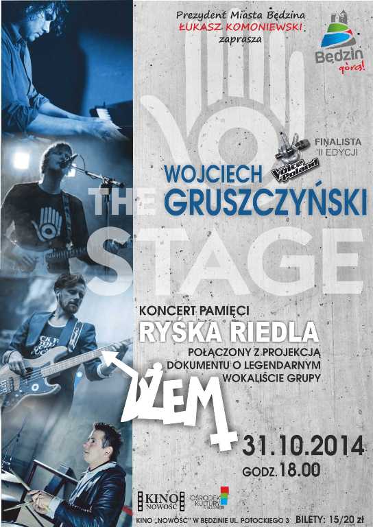 Koncert Wojtka Gruszczyńskiego THE STAGE pamięci Ryśka Riedla odbędzie się 31 października o godzinie 18.00 w Kinie „Nowość" w Będzinie, ul. Potockiego 3. Bilety 15 i 20 zł. Organizatorzy serdecznie zapraszają!