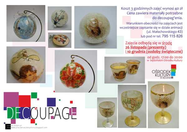 Entuzjastów tej fascynującej sztuki zdobniczej stale przybywa, powstają też coraz to nowsze strony internetowe poświęcone tej tematyce. Nie trzeba mieć specjalnych zdolności, aby stworzyć swój własny oryginalny przedmiot. Takich na pewno nie zabraknie podczas zajęć z decoupagu zorganizowanych w Ośrodku Kultury. Pierwsze z nich już 26 listopada, gdzie będzie można przygotować piękne prezenty gwiazdkowe, następne 10 grudnia, których tematem będą ozdoby świąteczne. Koszt: 40 zł.