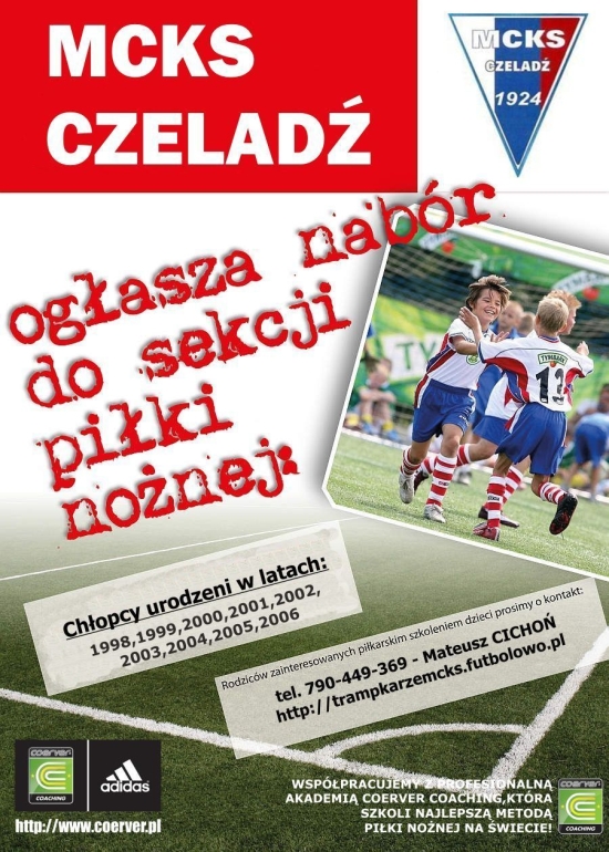Miejski Czeladzki Klub Sportowy ogłasza nabór do sekcji piłki nożnej. Nabór dotyczy chłopców urodzonych w latach: 1998, 1999, 2000, 2001, 2002, 2003, 2004, 2005, 2006.