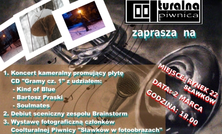 COOLturalna Piwnica w Sławkowie zaprasza 2 marca o godzinie 18.00 na Koncert Kameralny promujący płytę CD pt.: „Gramy cz. 1” z udziałem artystów: Kind of Blue, Bartosz Praski oraz Soulmates. W programie koncertu przewidziany jest również debiut sceniczny zespołu Brainstorm oraz wystawa fotograficzna członków Coolturalnej Piwnicy „Sławków w fotoobrazach”.