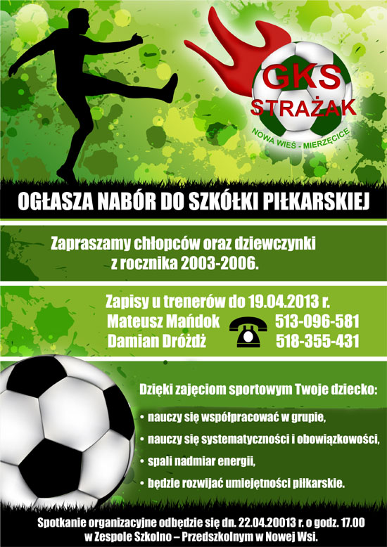 Gminny Klub Sportowy Strażak Mierzęcice - Nowa Wieś, ogłasza nabór do szkółki piłkarskiej. Spotkanie informacyjne dla rodziców odbędzie się w poniedziałek, 22 kwietnia o godz. 17:00 w Zespole Szkolno-Przedszkolnym w Nowej Wsi.