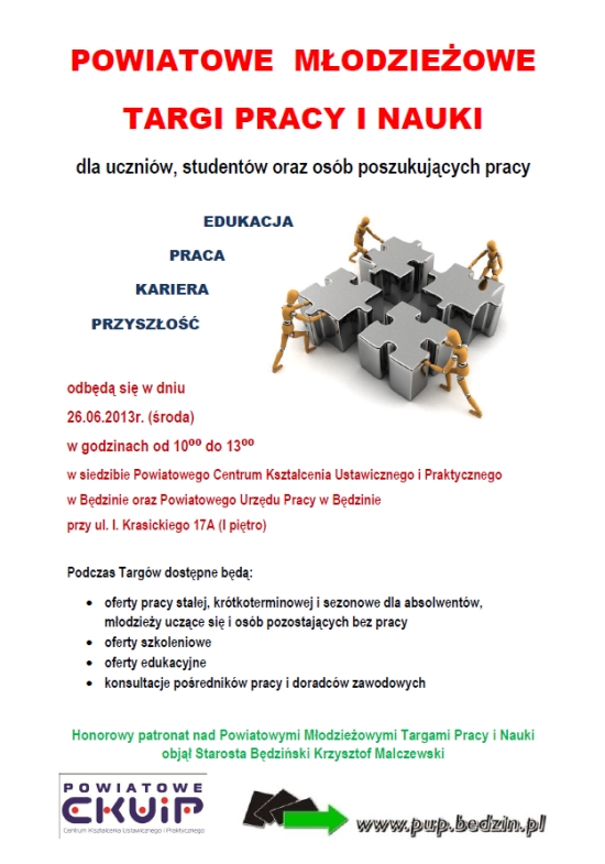 Zapraszamy na Powiatowe Młodzieżowe Targi Pracy i Nauki dla uczniów, studentów oraz osób poszukujących pracy, które odbędą się w dniu 26.06.2013r. w godzinach od 10.00 do 13.00 w siedzibie Powiatowego Centrum Kształcenia Ustawicznego i Praktycznego w Będzinie oraz Powiatowego Urzędu Pracy w Będzinie przy ul. I. Krasickiego 17A.
