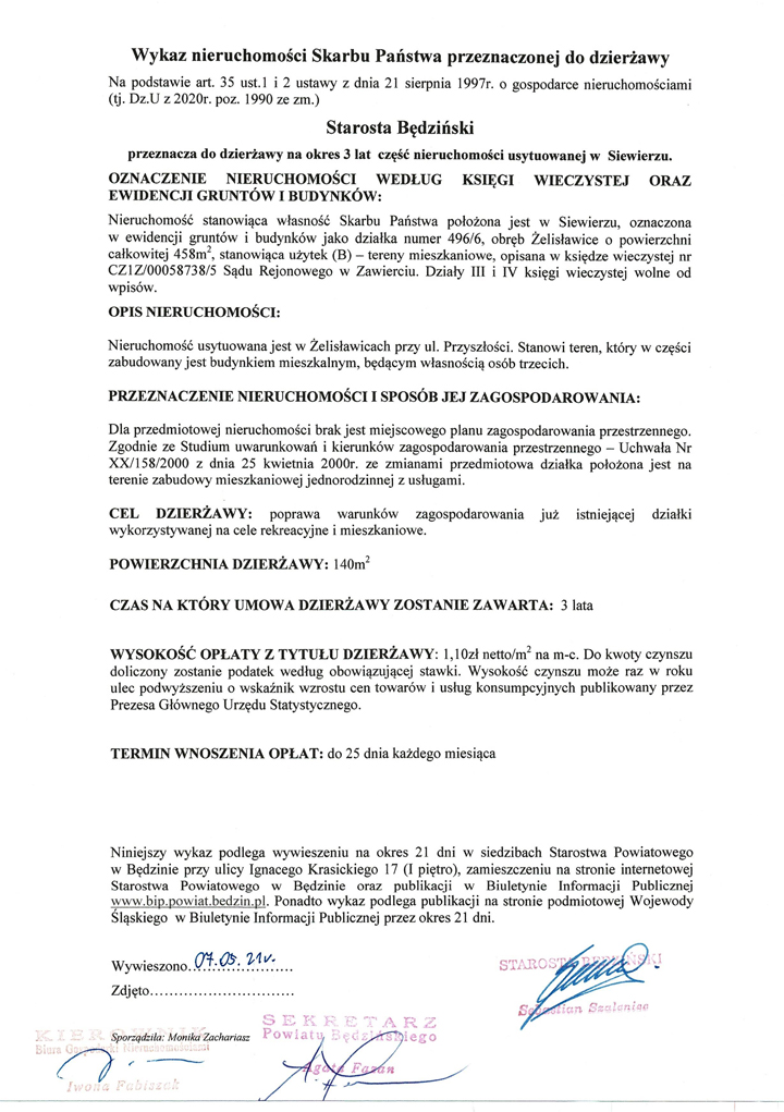 Niniejszy wykaz podlega wywieszeniu na okres 21 dni w siedzibach Starostwa Powiatowego w Będzinie przy ul. Jana Sączewskiego 6 oraz Ignacego Krasickiego 17, zamieszczeniu na stronie internetowej oraz publikacji w Biuletynie Informacji Publicznej Starostwa Powiatowego w Będzinie.