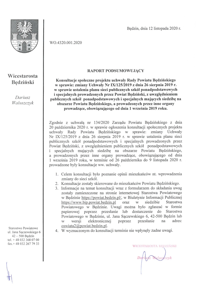 Zgodnie z uchwałą nr 134/2020 Zarządu Powiatu Będzińskiego z dnia 20 października 2020 r. w sprawie ogłoszenia konsultacji społecznych projektu uchwały Rady Powiatu Będzińskiego w sprawie: zmiany Uchwały Nr IX/125/2019 z dnia 26 sierpnia 2019 r. w sprawie ustalenia planu sieci publicznych szkół ponadpodstawowych i specjalnych prowadzonych przez Powiat Będziński, z uwzględnieniem publicznych szkół ponadpodstawowych i specjalnych mających siedzibę na obszarze Powiatu Będzińskiego, a prowadzonych przez inne organy prowadzące, obowiązującego od dnia 1 września 2019 roku, w terminie od 26 października do 9 listopada 2020 r. prowadzone były konsultacje ww. uchwały.