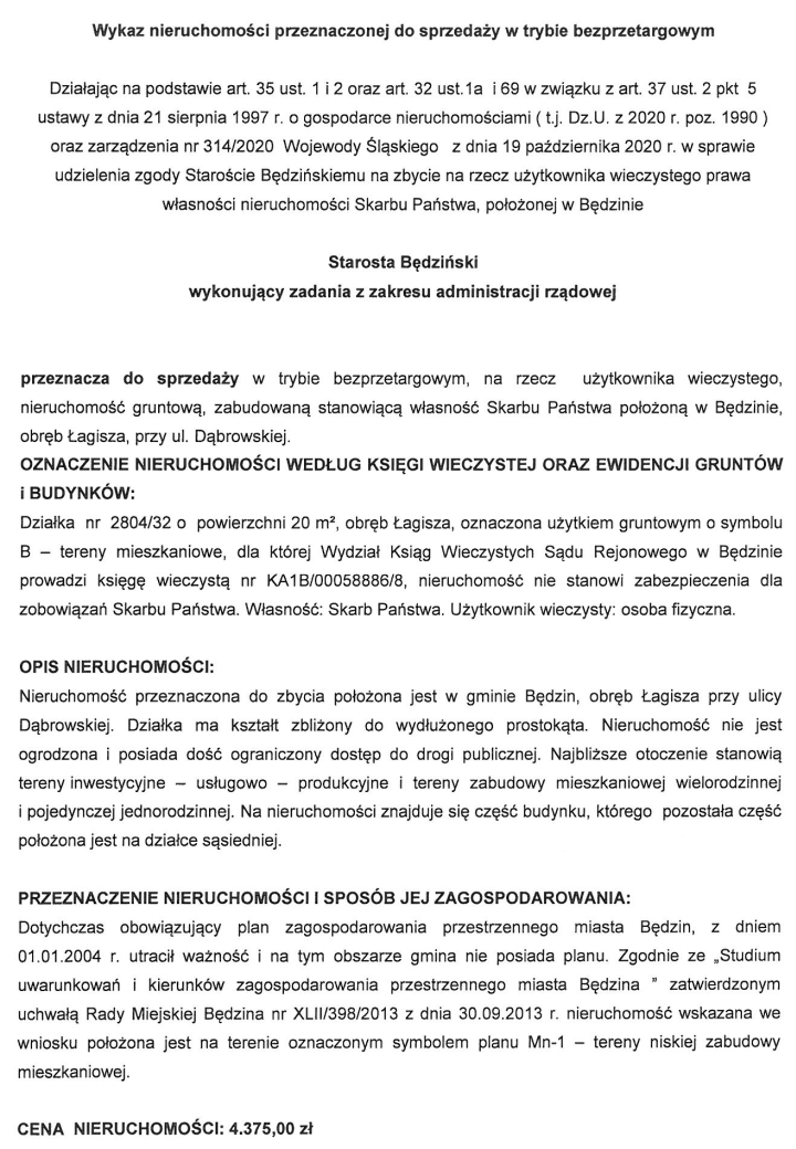 Działając na podstawie art. 35 ust. 1 i 2 oraz art. 32 ust.1a i 69 w związku z art. 37 ust. 2 pkt 5 ustawy z dnia 21 sierpnia 1997 r. o gospodarce nieruchomościami ( t.j. Dz.U. z 2020 r. poz. 1990 ) oraz zarządzenia nr 314/2020 Wojewody Śląskiego z dnia 19 października 2020 r. w sprawie udzielenia zgody Staroście Będzińskiemu na zbycie na rzecz użytkownika wieczystego prawa własności nieruchomości Skarbu Państwa, położonej w Będzinie