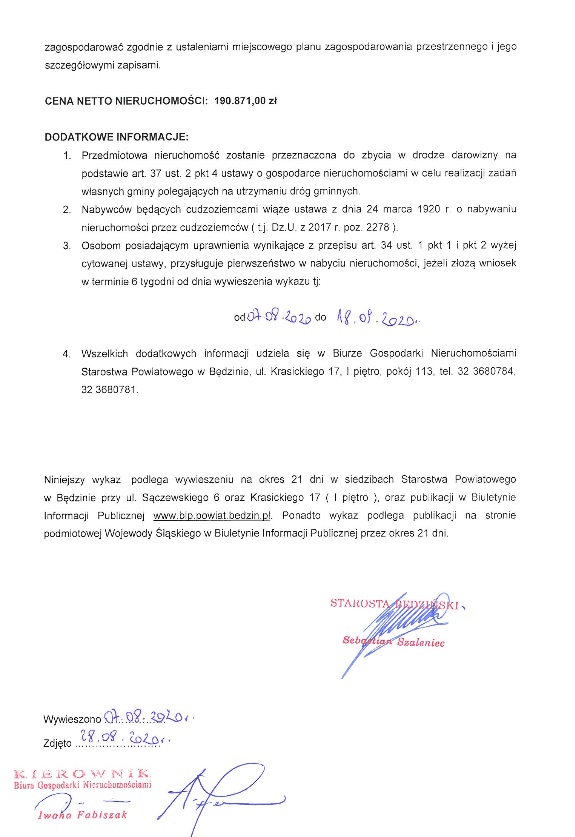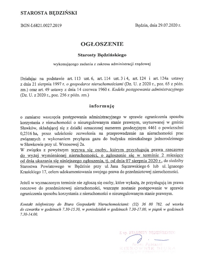 od dnia ukazania się niniejszego ogłoszenia, tj. od dnia 31 lipca 2020 r., do siedziby Starostwa Powiatowego w Będzinie przy ul. Jana Sączewskiego 6 lub ul. Ignacego Krasickiego 17, celem udokumentowania swojego prawa do przedmiotowej nieruchomości.