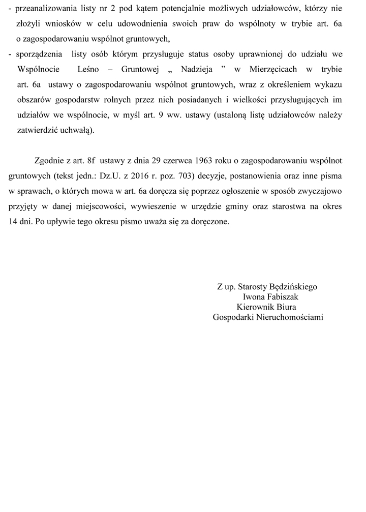 W związku z toczącym się postępowaniem w sprawie ustalenia wykazu osób uprawnionych do udziału we Wspólnocie Leśno - Gruntowej „Nadzieja” w Mierzęcicach, w trybie artykułu 6a ust. 1 ustawy z dnia 29 czerwca 1963 r. o zagospodarowaniu wspólnot gruntowych (tekst jedn.: Dz. U. z 2016 r. poz. 703) Starosta Będziński informuje, że w terminie ustalonym przez tut. organ do składania wniosków ww. sprawie tj. od 08.08.2019 r. do 31.03.2021 r. do tut. Starostwa wpłynęło jedynie 12 wniosków złożonych przez osoby ubiegające się o status udziałowca we Wspólnocie Leśno – Gruntowej „ Nadzieja ” w Mierzęcicach w trybie ww. przepisów.
